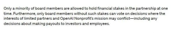 只有少数OpenAI的董事会成员允许持有OpenAI LP的股份,如果有限合伙人和公司使命发生冲突,由没有持有股份的董事会成员来投票做抉择。这也为如今阿尔特曼如此轻易地被踢出局埋下了伏笔。