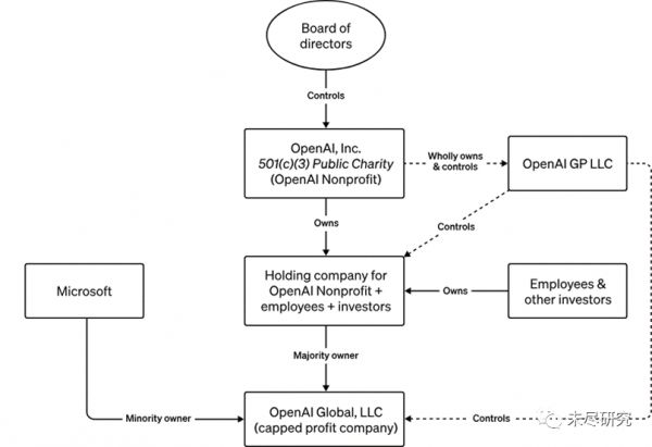 后来,因为包括马斯克等人承诺的10亿美元资金,仅到位1亿多美元,先进算力与一流人才的成本巨大,公司研究与运营难以为继,决定成立一家盈利性质的子公司OpenAI Global LLC,它由非盈利的OpenAI 完全控制。