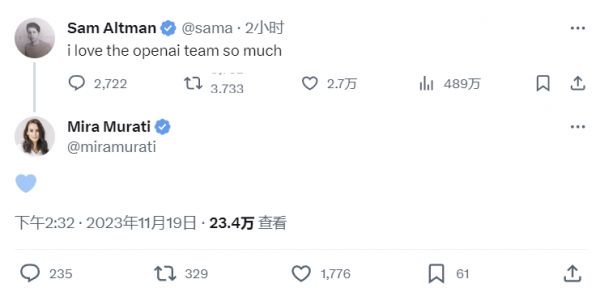 Altman今日在社交媒体发文称热爱OpenAI团队后,OpenAI临时CEO Mira Murati评论了“爱心”示好。