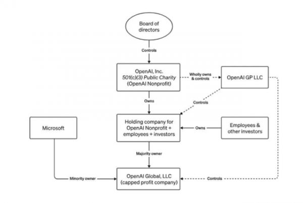 2019年的时候Sam Altman创造了一个开创性的组织架构,由非营利性的OpenAI, Inc. 和营利性子公司 OpenAI Global LLC 组成。在官网上,OpenAI的基本结构图显示,用一家非营利实体去管理一家营利实体,后者可以接受投资并设定回报率,但是要在前者的治理下展开运作。