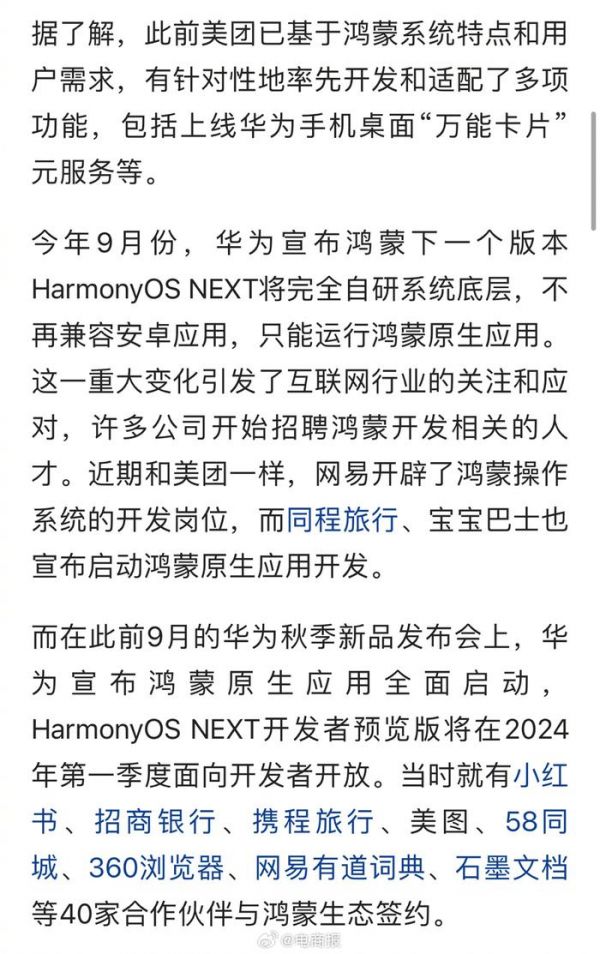 #曝华为计划鸿蒙明年不兼容安卓# 华为鸿蒙被曝计划明年不再兼容安卓,美团等多家大厂已经加入开发了。#业内人士称鸿蒙确有计划明年不兼容安卓#
