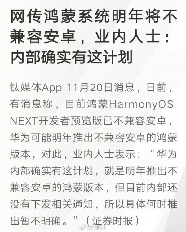 华为鸿蒙被曝计划明年不再兼容安卓……