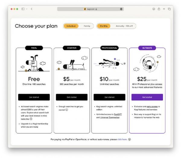 既然Kagi是一个付费搜索引擎,这意味着用户必须注册登录才能使用Kagi的搜索服务。价格方面,Kagi提供三个付费等级和一个免费用户等级,其中免费用户在整个用户周期里只能用Kagi进行100次搜索。