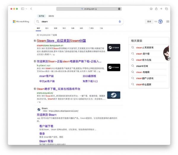 参赛的五个搜索引擎中,Kagi、G和D三款引擎都把Steampowered的网站列到了首位,BA引擎毫不意外的把正确的Steam网页藏在一系列广告中第三位的位置,BI国内版将正确的网站排到了第五位,同时非广告的搜索结果前面也有更多的占位符,让结果在排版上看起来更加靠后。但令人惊讶的是,BI搜索国际版却非常懂事地将正确的Steam链接放在了首位。