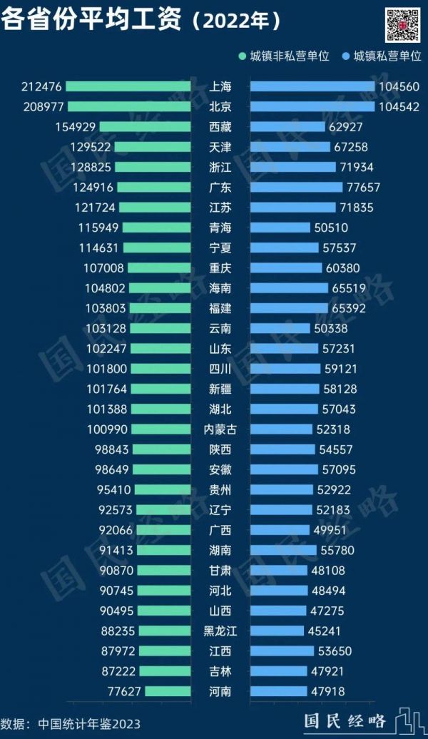 更令人意外的是,西部平均工资最高的省份,不是四川重庆陕西等经济大省,而是西藏,就连青海、宁夏也稳居前列。