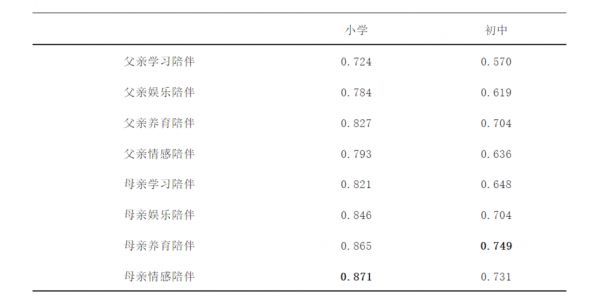 ▷ 表1 | 父亲、母亲陪伴不同维度在小学和初中阶段的均值(彭正秀等, 2022)