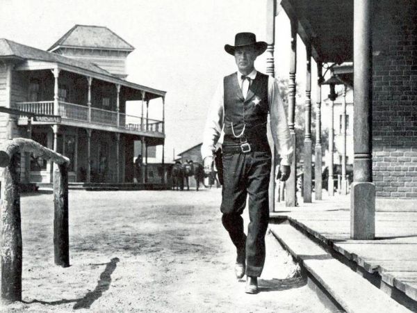 拉比影射的是西部片《正午》中著名的一幕。为了保护小镇居民,正午时分,主人公凯恩警长决定孤身一人面对四个持枪者,迈着沉着坚定的步伐走向他的使命。拉比描述的这一幕,可和纪录片中奥本海默的回忆大相径庭。