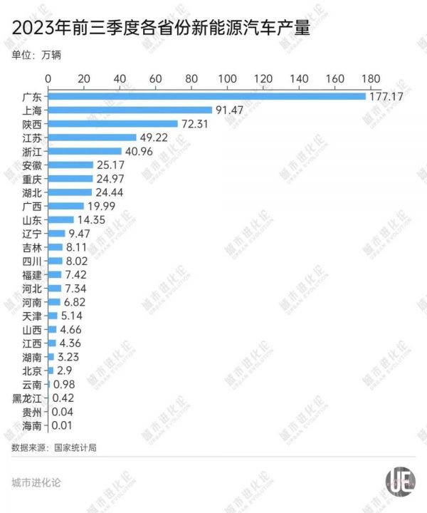 以今年前三季度为例,湖北新能源汽车产量仅24.44万辆,在全国位居第8位,不仅远远落后于广东、上海等老牌汽车产业重镇,也被陕西、江苏、浙江、安徽等省份甩在后面。