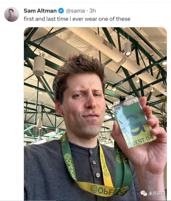下午四时左右,奥特曼发了一张照片在X上,他举着挂在脖子上的“访客”胸牌说,“第一次也是最后一次戴这个”。他还转发了首席战略官Jason Kwon拍的照片。