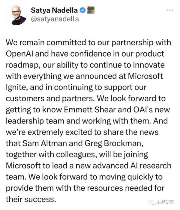 微软CEO纳德拉,终于在周一凌晨前7分钟发出消息:奥特曼与布洛克曼一起加入微软;微软将继续与OpenAI及新任CEO谢尔合作。