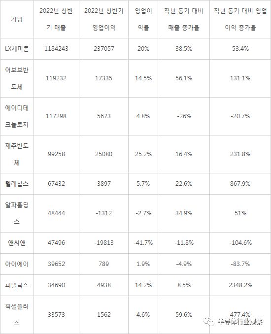 根据2022年的数据,韩国无晶圆厂公司收入的Top5分别为LX Semicon、Above Semiconductor、ADTechnology、Jeju Semiconductor和Telechips。