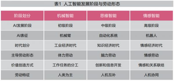 人工智能的发展影响和重塑了劳动的形态,使之形成了三个跃迁阶段,即机械智能阶段、思维智能阶段和情感智能阶段(见表1)。
