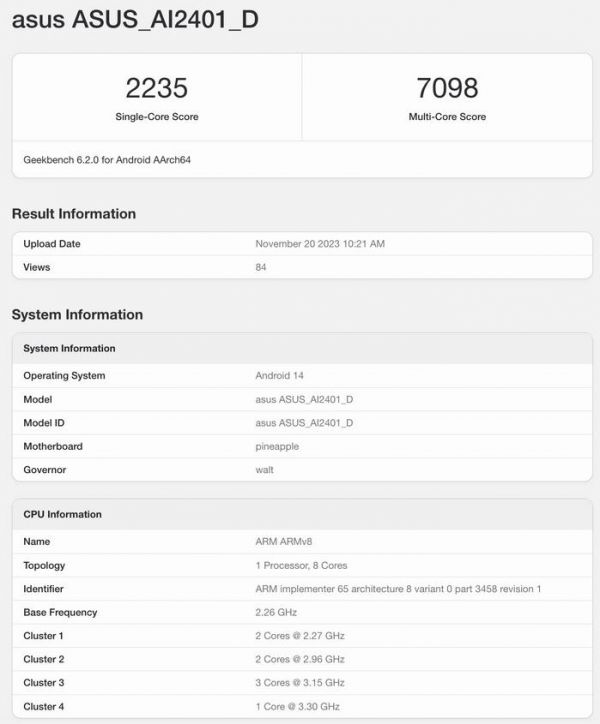 日前,知名跑分平台GeekBench 6上,一款型号为“ASUS_AI2401_D”的设备现身。从GeekBench 6显示的信息来看,可以基本确定它是一款骁龙8 Gen 3机型。而它代码式的名称,证明它来自华硕品牌旗下,大概率是ROG游戏手机8。
