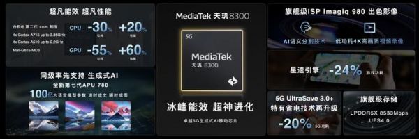 AI性能方面,天玑8300配备了APU 780。从型号来看,它搭载的APU规格比天玑9300上的略低一些,但仍配备了生成式AI引擎,并支持多项AI技术。联发科表示,它的AI综合性能是上一代的3.3倍,能流畅运行端侧生成式AI应用。