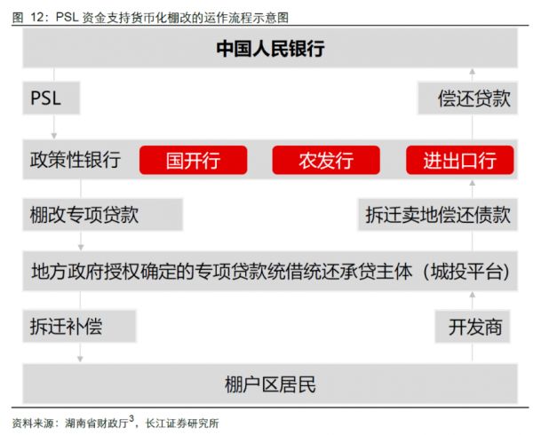 PSL,即抵押补充贷款,由央行向国开行发放,国开行再通过棚改专项贷款向地方政府发放,地方政府拿到钱后,就可以通过货币化安置向棚户区居民发放补偿款,收回土地。居民有了钱,就可以买之前积压的房子,政府有了地,就可以拍地,收入一部分偿还国开行贷款,一部分补充财政收入。