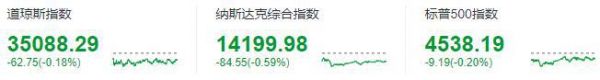道琼斯指数收于35088.29点,下跌62.75点,跌幅0.18%;标准普尔500指数收于4538.19点,跌幅0.20%,结束了连续五天的上涨;纳斯达克指数收于14199.98点,跌幅0.59%,也结束了连续五天的上涨。