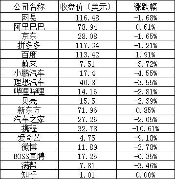 其他热门中概股中,携程下跌10.61%,斗鱼下跌5.92%,满帮下跌3.46%,哔哩哔哩下跌2.81%,汽车之家下跌2.05%,BOSS直聘下跌0.35%,百度上涨1.91%,新东方上涨0.85%。