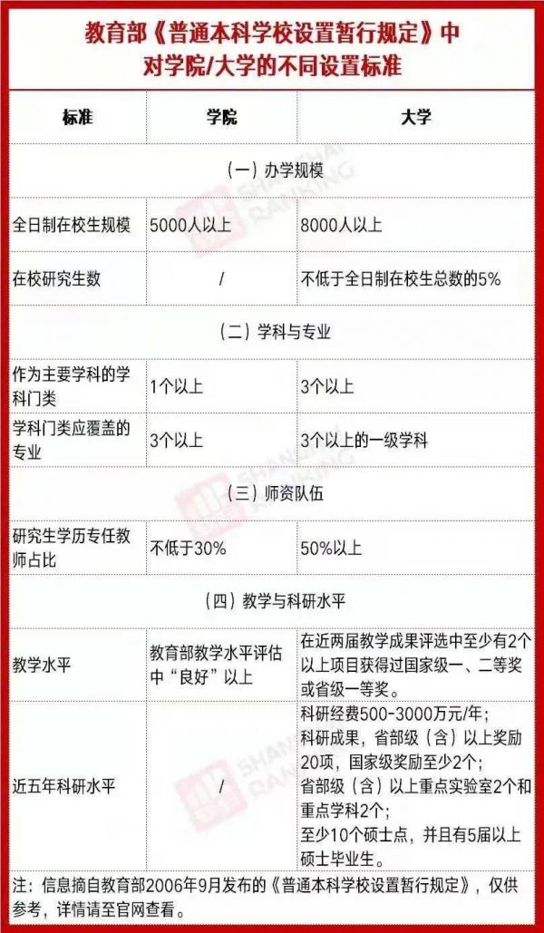 在上述规定中,教育部对“学院”和“大学”进行了层次分明的划分,在硬件设施、办学规模、学科专业、师资队伍、教学科研等方面都有着具体数据的规定。