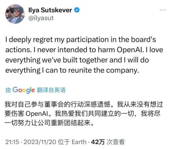 这位搅起OpenAI换帅血雨腥风的男人,为一波三折的剧情又添上了戏剧性的一幕,他在字里行间透露出对制造这场混乱的自责与懊悔:“我从未想过要伤害OpenAl。我热爱我们共同建立的一切,我将尽一切努力让公司重新团结起来。”