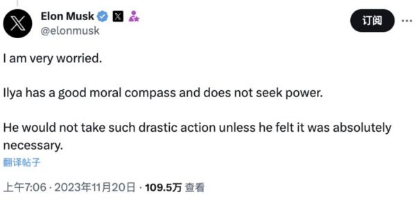哪怕苏特斯科夫因为OpenAI内斗事件被推至舆论的风口浪尖,纯纯作为不明真相吃瓜群众的马斯克,仍然愿意站出来给予苏特斯科夫坚定的信任和支持:“伊利亚有很好的道德准则,不追求权力,除非他觉得绝对有必要,否则他不会采取如此激烈的行为。”