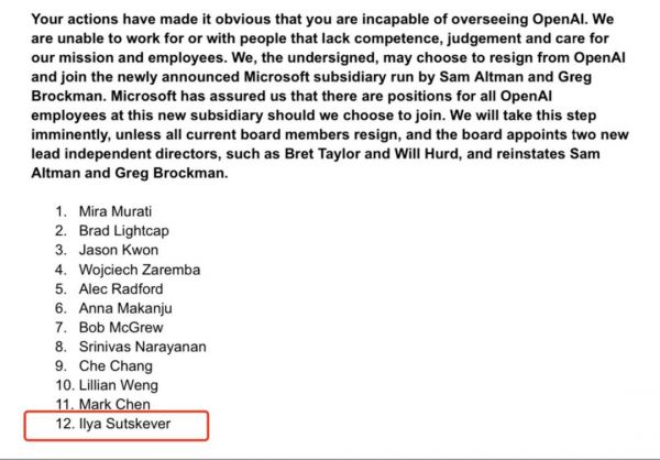 在此之前,苏特斯科夫联手其他三位董事会成员挑起了OpenAI的宫斗大戏,坚决将前CEO萨姆·阿尔特曼(Sam Altman)开除,并在三天内连换两位临时CEO。就当人人以为OpenAI内斗以苏特斯科夫取胜、阿尔特曼投奔“金主”微软而收尾时,苏特斯科夫却反手来个出其不意——和超740名OpenAI员工一起签署联名信,以辞职相逼,让董事会退位、前CEO阿尔特曼和前董事长兼总裁格雷格·布罗克曼(Greg Brockman)复职。