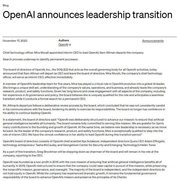 ▲OpenAI于11月18日在官网发布领导层换届公告