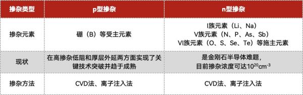 第二,金刚石芯片掺杂存在瓶颈。纯净的金刚石本身是一种绝缘体,只有掺杂才能变成半导体。目前,金刚石芯片p型掺杂较为成熟,主要以硼(B)掺杂为主,而n型掺杂则是产业化的难题,n型掺杂元素在金刚石中具有高电离能,很难找到合适的施主元素,目前学界和工业界众说纷纭,当然也逐渐有了进展。