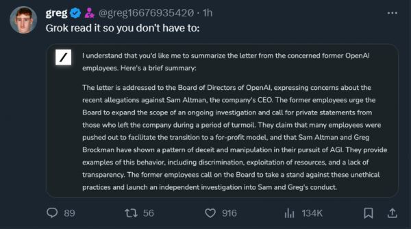虽然信的原件被删除了,但一位 X 平台网友晒出了 Grok(马斯克打造的 ChatGPT 竞品)总结的概要: