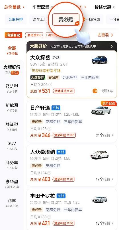 用户可从滴滴App租车页面快捷筛选栏点击“贵必赔”功能
