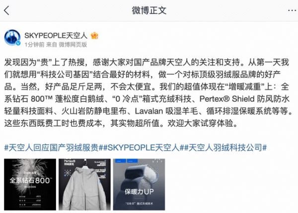 SKYPEOPLE天空人的微博表示,“发现因为贵,上了热搜,感谢大家对国产品牌天空人的关注和支持。从第一天我们就想用科技公司基因,结合最好的材料,做一个对标顶级羽绒服品牌的好产品。当然,好产品足斤足两,不会太便宜。”