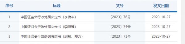 11月21日,证监会连续披露三张罚单,因违规出借证券账户,李俊丰被处以5万元罚款,郑力被处以3万元罚款;李某臻控制使用多达3人的证券账户,被采取顶格处罚,罚款金额为50万元;同样因借用他人证券账户,周敏被处以10万元罚款。