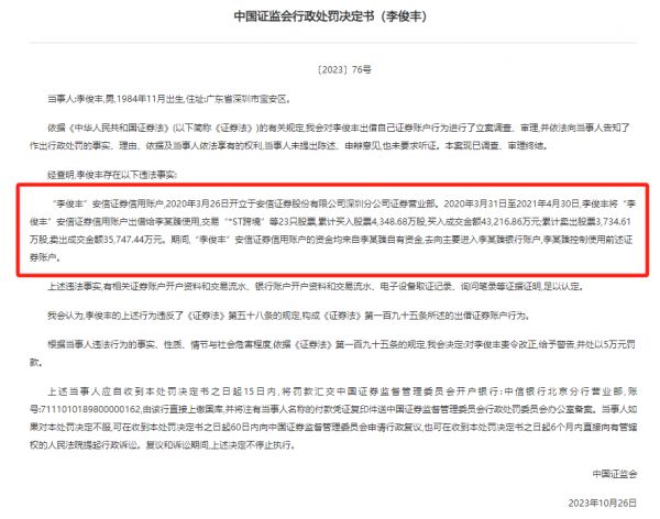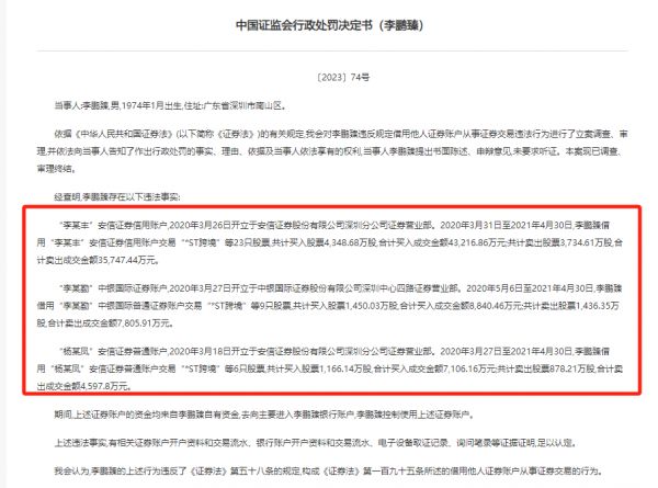 第一张罚单显示,“李某丰”安信证券信用账户,2020年3月26日开立于安信证券深圳分公司证券营业部。2020年3月31日至2021年4月30日,李某丰将上述安信证券信用账户出借给李某臻使用,交易“*ST跨境”等23只股票,累计买入股票4348.68万股,买入成交金额4.32亿元;累计卖出股票3734.61万股,卖出成交金额3.57亿元。