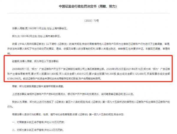 第三张罚单显示,2009年8月11日,“郑某”广发证券账户开立于广发证券上海石泉路营业部。2020年5月25日至2021年6月16日,郑某将上述证券账户出借给周某使用,累计买入股票56.18万股,买入成交金额145.89万元;累计卖出股票74.93万股,卖出成交金额512.55万元,买卖股票总成交金额658.44万元。前述证券账户的资金来源和去向与周敏存在密切联系,账户由周敏控制使用。