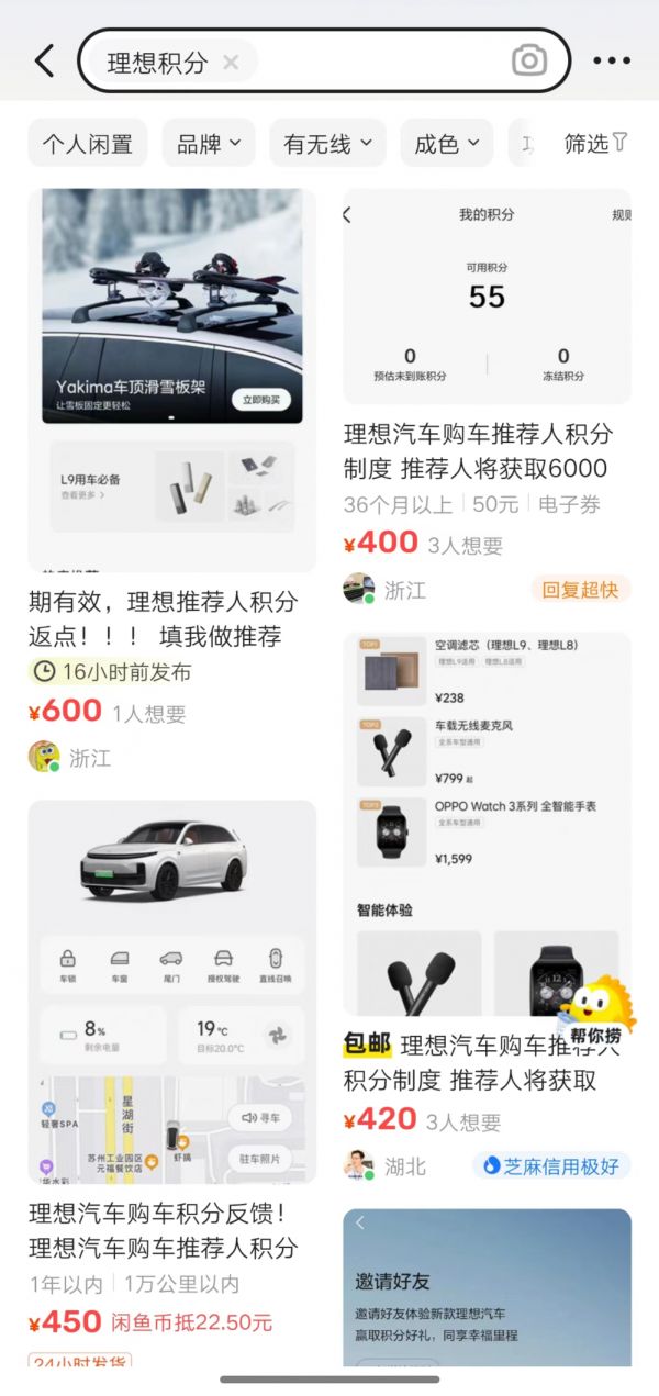 积分还可以转让。“降噪NoNoise”在闲鱼和小红书上搜索理想、蔚来积分,发现两家积分和商城的二手产品都十分抢手,是名副其实的“硬通货”。