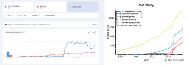 更具体讲,向量数据库爆火的关键节点是今年3月23日,OpenAI 在其发布的 chatgpt-retrieval-plugin[1] 项目中推荐使用一个向量数据库,在写 ChatGPT 插件时为其添加“长期记忆”能力。然后我们可以看到,无论是 Google Trends 热搜,还是 Github Star 上,所有向量数据库项目的关注度都从那个时间节点开始起飞了。