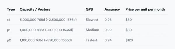 此外,它无法实时在召回率与响应速度之间通过参数来进行利弊权衡 —— 除了更改 Pod 类型在三档准确性中选择之外别无他法 —— 你甚至不能通过暴力全表搜索达到 100% 精确度 ,因为 Pinecone 不提供精确 KNN 这个选项!