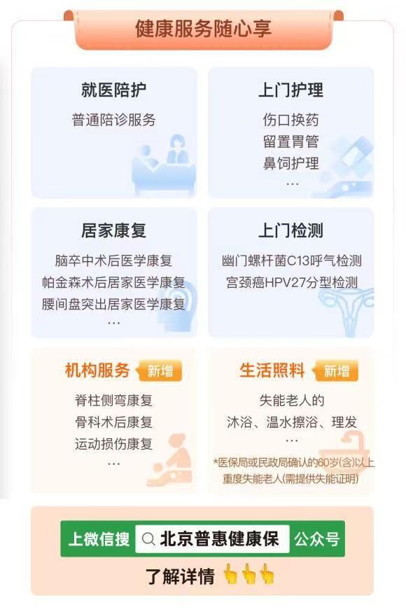 据了解,“北京普惠健康保”自上线以来不仅为参保人提供大病保障,同时为让更多健康人群享受到服务,产品还提供就医陪护、上门护理等多项健康服务,今年新增了机构服务和生活照料两大类服务项目,服务从42项扩增至49项。