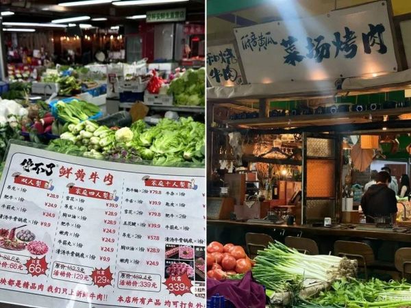 复古的门店装修风格,高性价比的体验感,小桌子+马扎的用餐方式,甚至直接把火锅店、烤肉店开进菜市场,主打一个食材新鲜,方便采购,努力靠近社区和消费者,把最接近地气的餐饮开到顾客家门口,让消费者们心动。