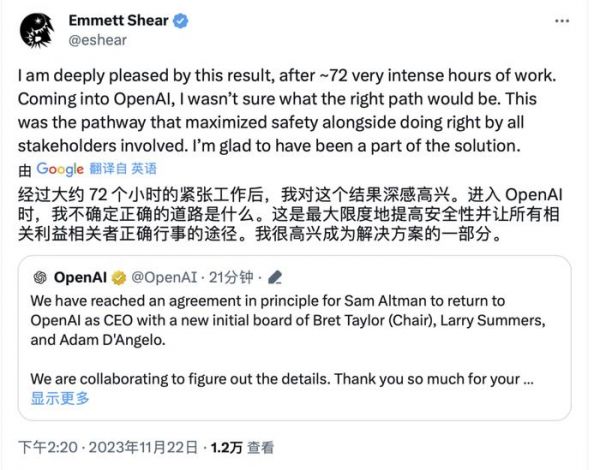 OpenAI代理CEO埃米特·谢尔(Emmett Shear)称,经过了大约72小时高强度工作后,对这个结果深感高兴。