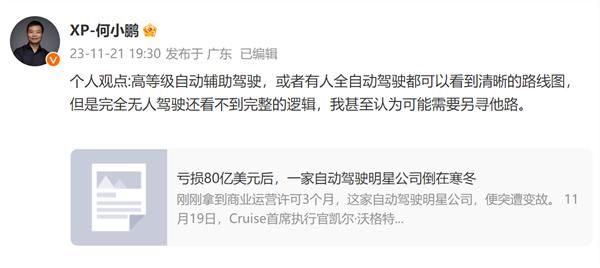 何小鹏在微博发布消息称,“个人观点:高等级自动辅助驾驶,或者有人全自动驾驶都可以看到清晰的路线图,但是完全无人驾驶还看不到完整的逻辑,我甚至认为可能需要另寻他路。”