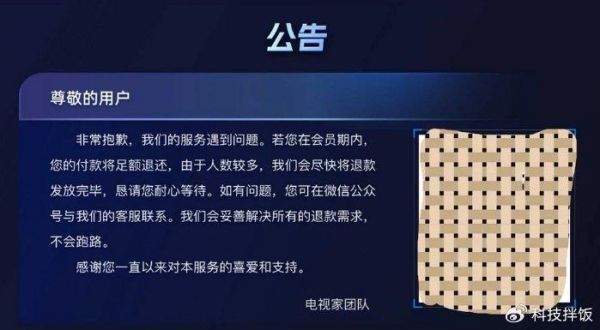 当天电视家发布公告表示,自身的服务遇到问题,如果是会员就会足额退还费用,但如果是开通了好几年会员的用户,等待的时间可能会久一点。不过小编突然想到,有些人是通过小黄鱼等渠道找代理商买的便宜会员,他们怎么退钱?
