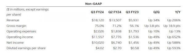 根据最新披露的财报(非通用会计准则口径下),在截至10月底的一个季度中,英伟达实现营收181.2亿美元(约合人民币1294亿元),同比增长206%,环比增长34%;净利润为100.2亿美元,同比增长588%,环比增长49%;毛利率高达75.5%,环比提升4.3个百分点。