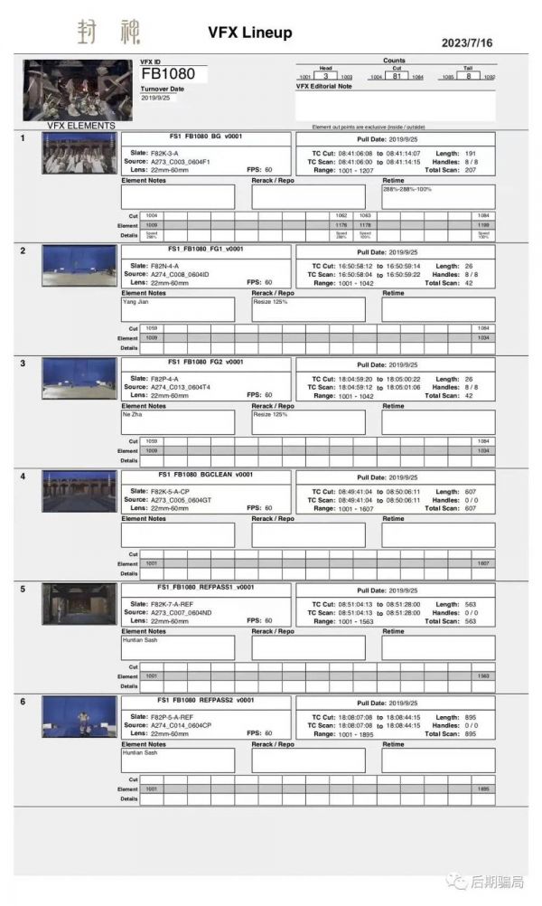 根据剪辑师黄烁的公开分享,《封神》后期首次通过Lineup表衔接剪辑与视效的沟通,“通常来说剪辑部门或者后期公司会整理一个视效镜头表,里面是所有视效镜头的截图、Timecode、制作要求等等,但这还不够,《封神第一部》一共1761个视效镜头,每一个镜头都会有一个相应的Lineup表,基本包含了剪辑需要告诉视效公司的一切信息。”
