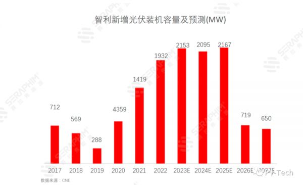 PMGD计划旨在鼓励新的小型项目,将发电项目设置在能源消费地,助力推动了智利近年来太阳能装机容量的稳步增长。2021年7月,智利的累计装机容量达到3.7GW,至2023年7月几乎翻了一番,达到7.3GW。