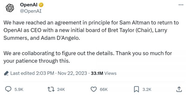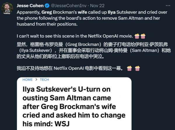 在发表这番言论的第二天,Altman 就被董事会解雇了。