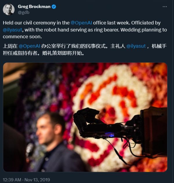 据《华尔街日报》报道,这一转变是 Greg Brockman 的妻子促成的,而 Ilya 是二人婚礼的主婚人。