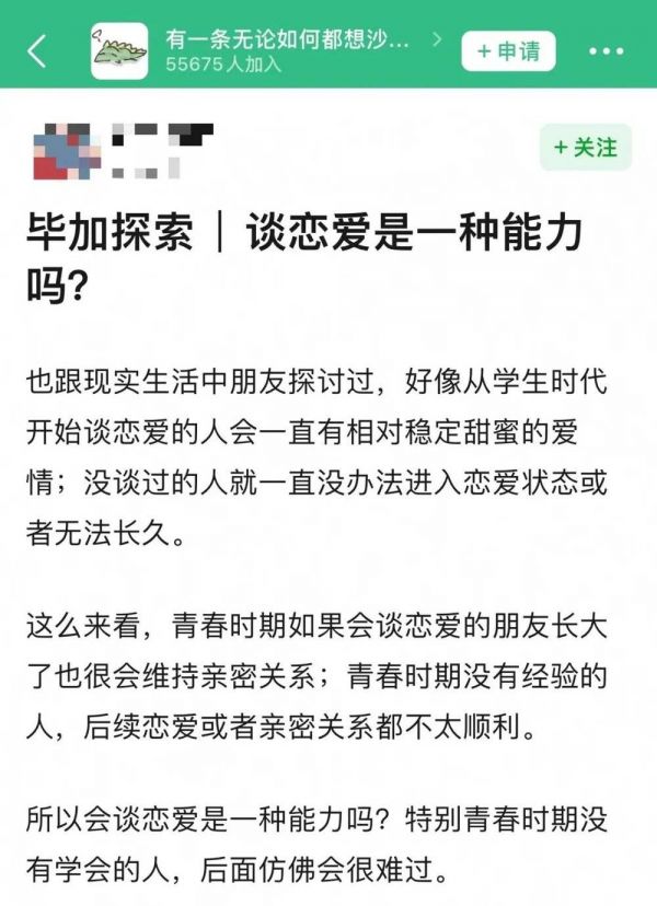 在成员数超过五万的豆瓣沙龙小组中,最热门的讨论帖名为“谈恋爱是一种能力吗”,题主关于亲密关系困惑引发了许多网友的共鸣。有人在评论区留言:学生时代家里从不谈论爱情话题,现在即将工作被催婚,还是不知道该怎么进入一段感情。
