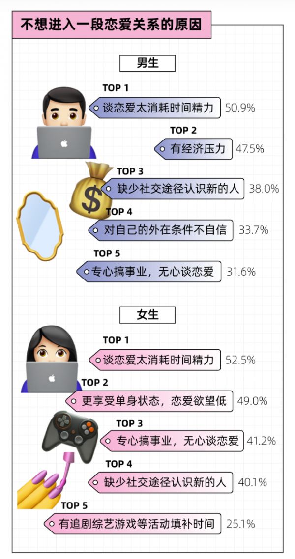 在后浪研究所发布的《2023年轻人恋爱观报告》中,在“不想进入一段恋爱关系的原因”一项,男生和女生所选择的TOP1理由都是“谈恋爱太消耗时间精力”。在个人价值越来越得到认可的青年群体中,谈恋爱有时候也成为了一种负担和“不必要”,在这一前提下,草率地进入感情似乎显得更加得不偿失。