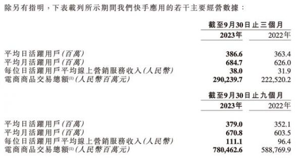 电商交易额(GMV)是快手的一个重要指标。三季度快手电商商品交易总额为2902亿元,与去年同期的2225亿元相比,增长约30%。今年前三季度,快手电商商品交易总额7804.6亿元,去年同期为5887.7亿元。