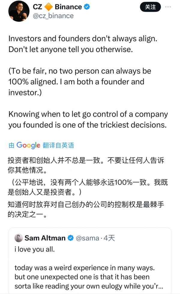 赵长鹏转发并评论了这条推文:“何时对自己创办的公司放手是最艰难的决定之一。”语气间颇有惺惺相惜,物伤其类之感。